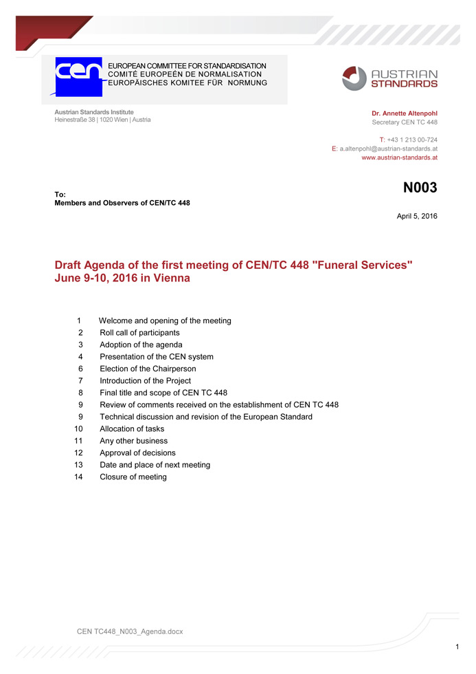 Za predsedajúcu osobu si delegácie zvolili Dr. Rolfa Lichtnera z EFFS, sekretárom komisie CEN/TC 448 sa stala Dr. Annette Altenpohl z Rakúskeho inštitútu pre štandardy (Austrian Standards). Za oficiálny názov komisie bol absolútnou väčšinou odhlasovaný názov „Funeral services“ a oficálnym cieľom revízie pôvodnej technickej normy EN15017/2005 sa stala – Štandardizácia v oblasti požiadaviek na pohrebné a s tým spojené služby.